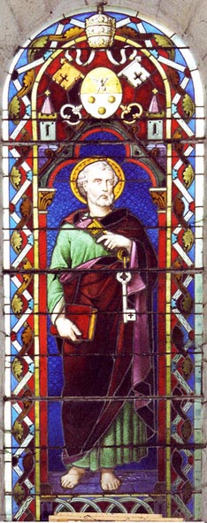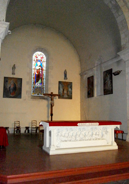 Celui de droite, le transept Sud, est dédié à saint Joseph. Sur le devant, c'est la mort du saint qui est représentée. C'est à cet autel qu'est conservée la réserve eucharistique. Les deux vitraux du mur Sud ont pour sujet la Sainte Famille et, à nouveau, la Mort de Joseph. Le premier a été offert par la famille Rouiller - Laurendeau, comme le vitrail de l'Assomption, au nord. Le second est daté de 1939. Egalement, une porte donne accès à la sacristie, autre vestige de l’église féodale détruite par l'incendie du 19e siècle. Le vitrail axial est consacré à saint Pierre orne le Chœur de l’église, ce qui peut surprendre dans la mesure où celle-ci est sous le vocable de Saint Martin. Il s'agirait probablement d'une référence à l'abbaye Saint-Pierre d'Airvault dont dépendait le prieuré-cure de Louin. Ce vitrail est encadré par deux statuettes de Saint Bernard et de Sainte Marie-Madeleine. Du côté du mur Nord un dernier vitrail représente l'Apparition de la Vierge à sainte Bernadette, à Lourdes. Sur le côté Sud du chœur, trône un beau crucifix en bois du 17e siècle. Le Christ, sans couronne d'épines, à la tête inclinée et les yeux clos, mobilier classé depuis 1980. Porte de l'ancienne église, Crucifix en bois du XVIIe siècle ( mobilier classé), entrée du presbytère du XVe siècle.