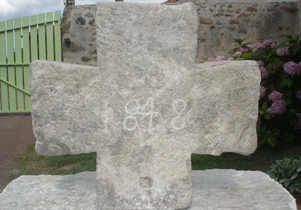 Croix de pierre calcaire dont le fût comporte un chanfrein, a été relevé et monté par Messieurs Maurice LAURENTIN et Marcel DAVID sur un socle formé d’une pierre de meule en granit qui appartenait à Monsieur René MIE, dans les années du début 1970.